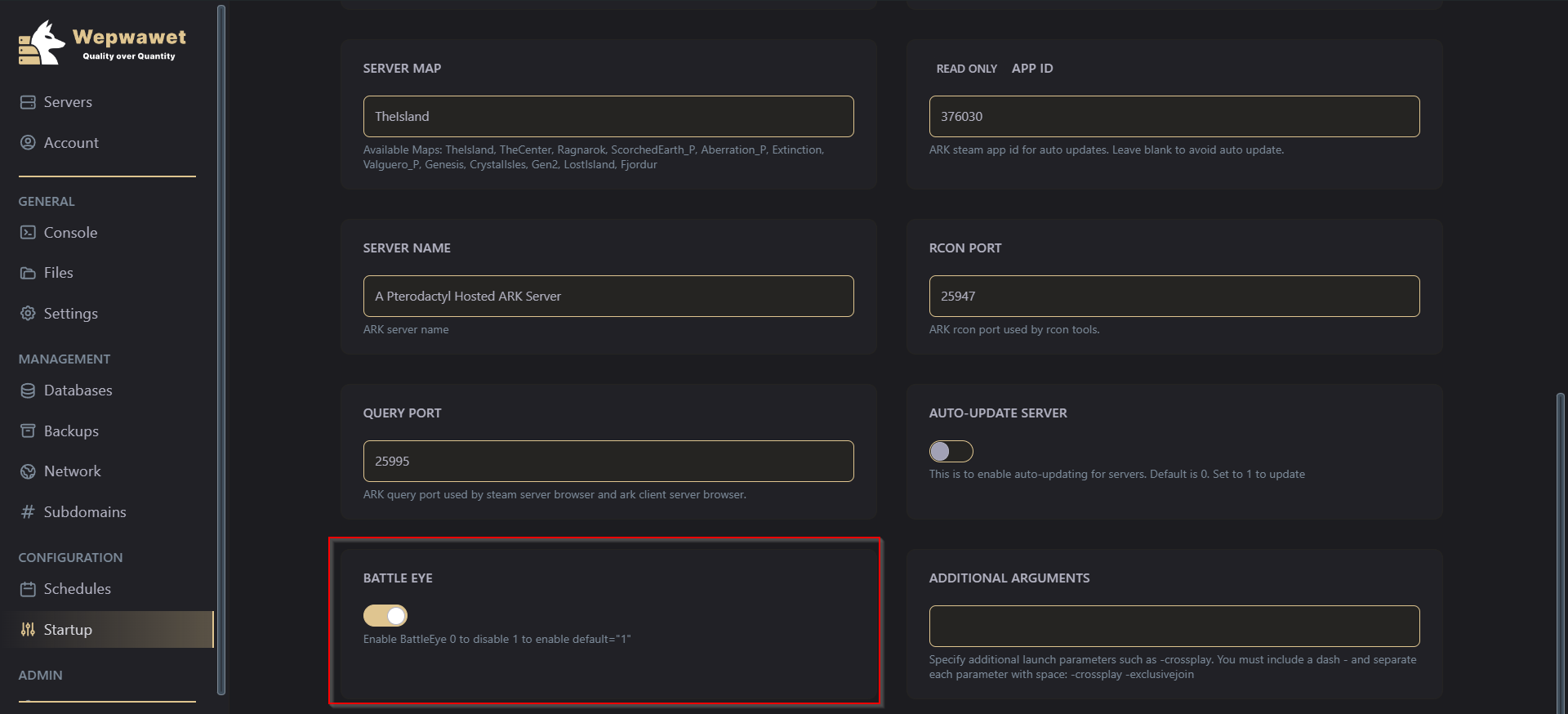 Disable battle eye by changing the “1” to a “0”. OFF position is 0 and ON position is 1.