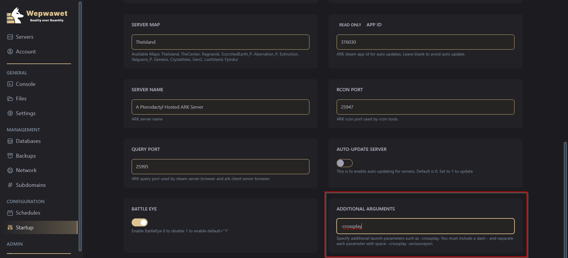 Add -crossplay to the additional arguments.
