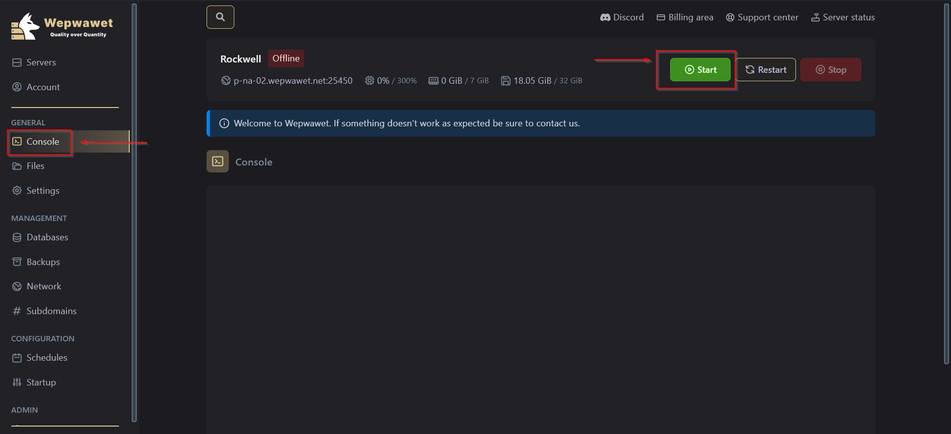Head over to the Console tab and Start the Server.