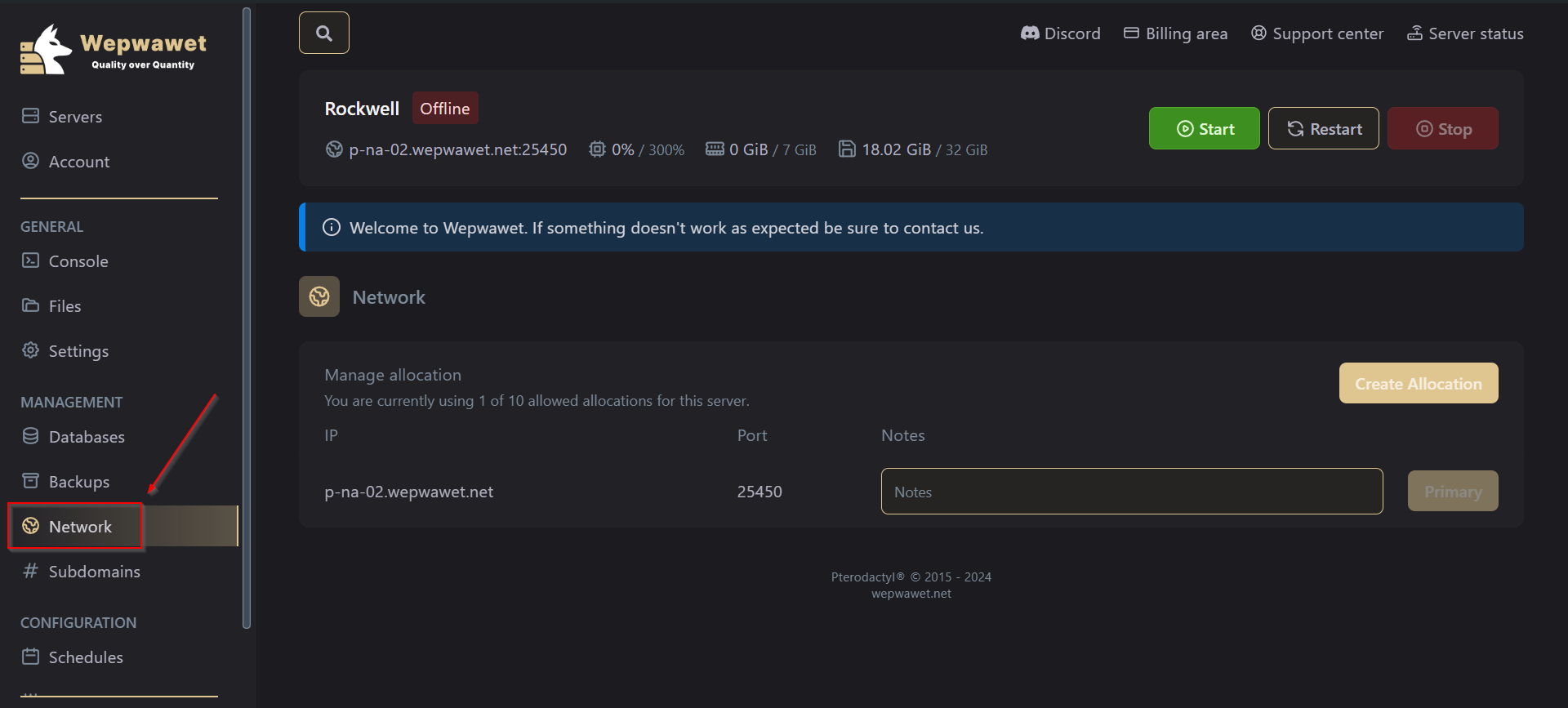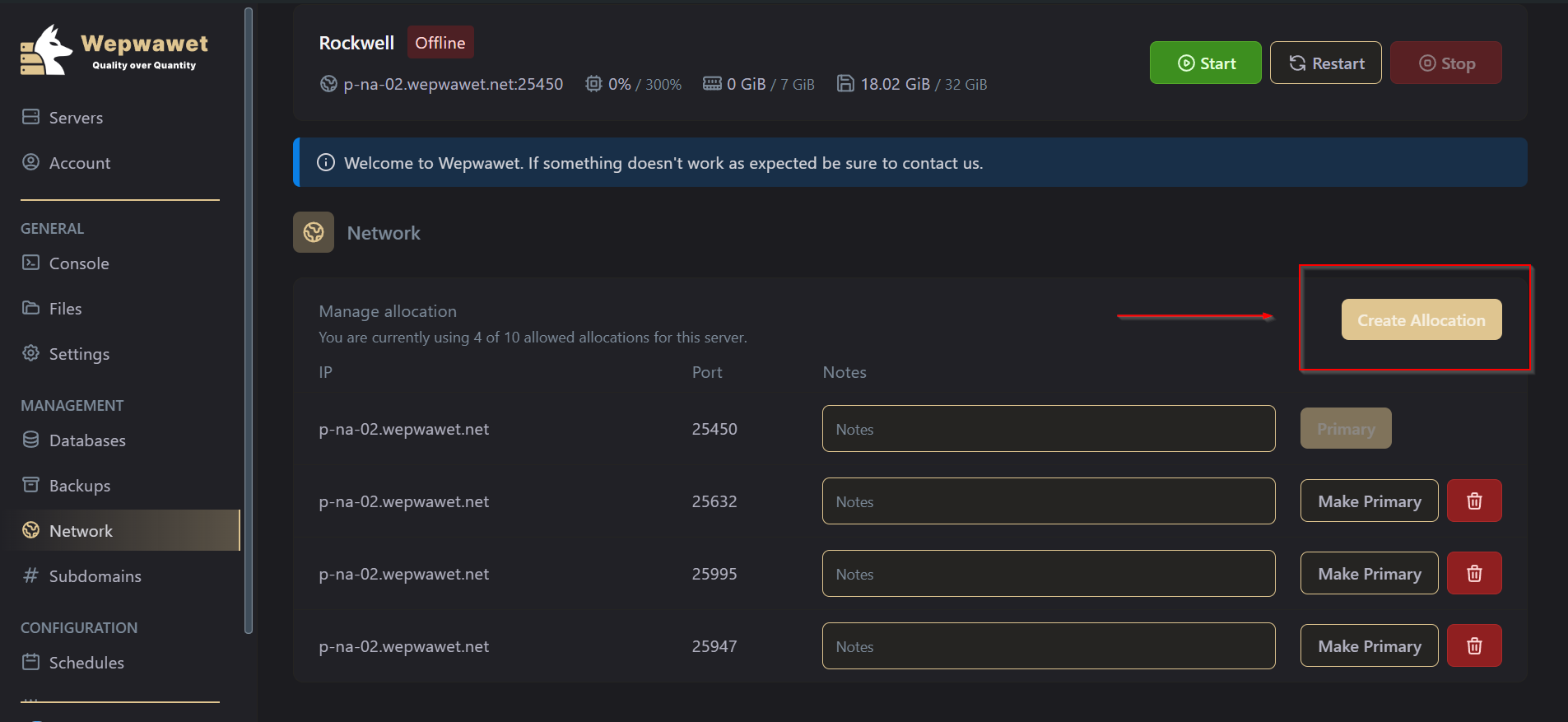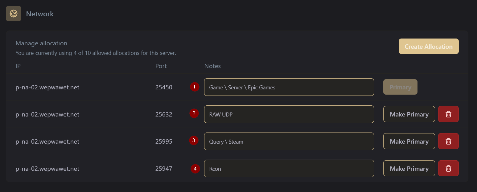 Fill in the following notes for the allocations, Name the primary port: Game \ Server \ Epic Games, Name the second port: RAW UDP, Name the third port: Query \ Steam, Name the last port: Rcon.