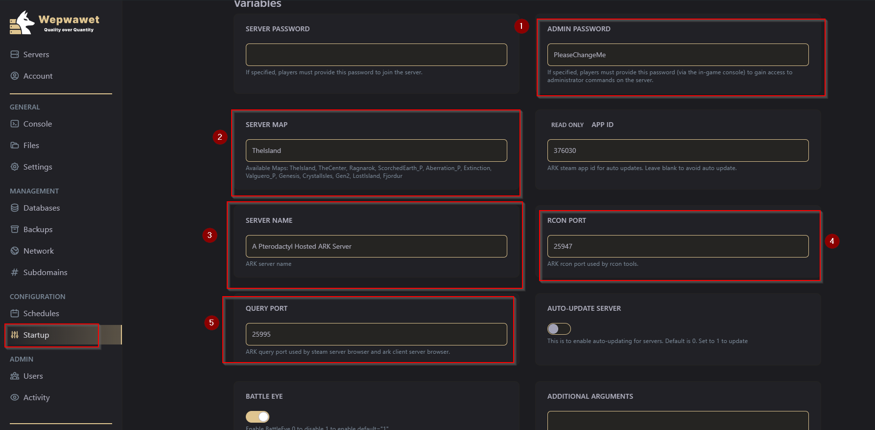Go to the Startup tab on the panel and set up your admin password, server map, server name, rcon port (use the rcon port you set on the network tab), query port (use the query port you put on the network tab).