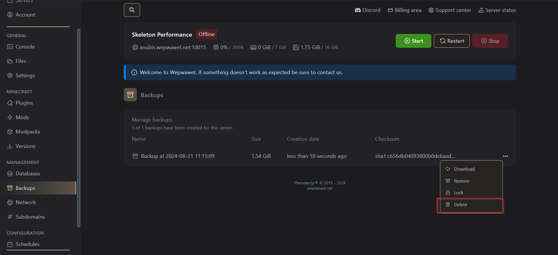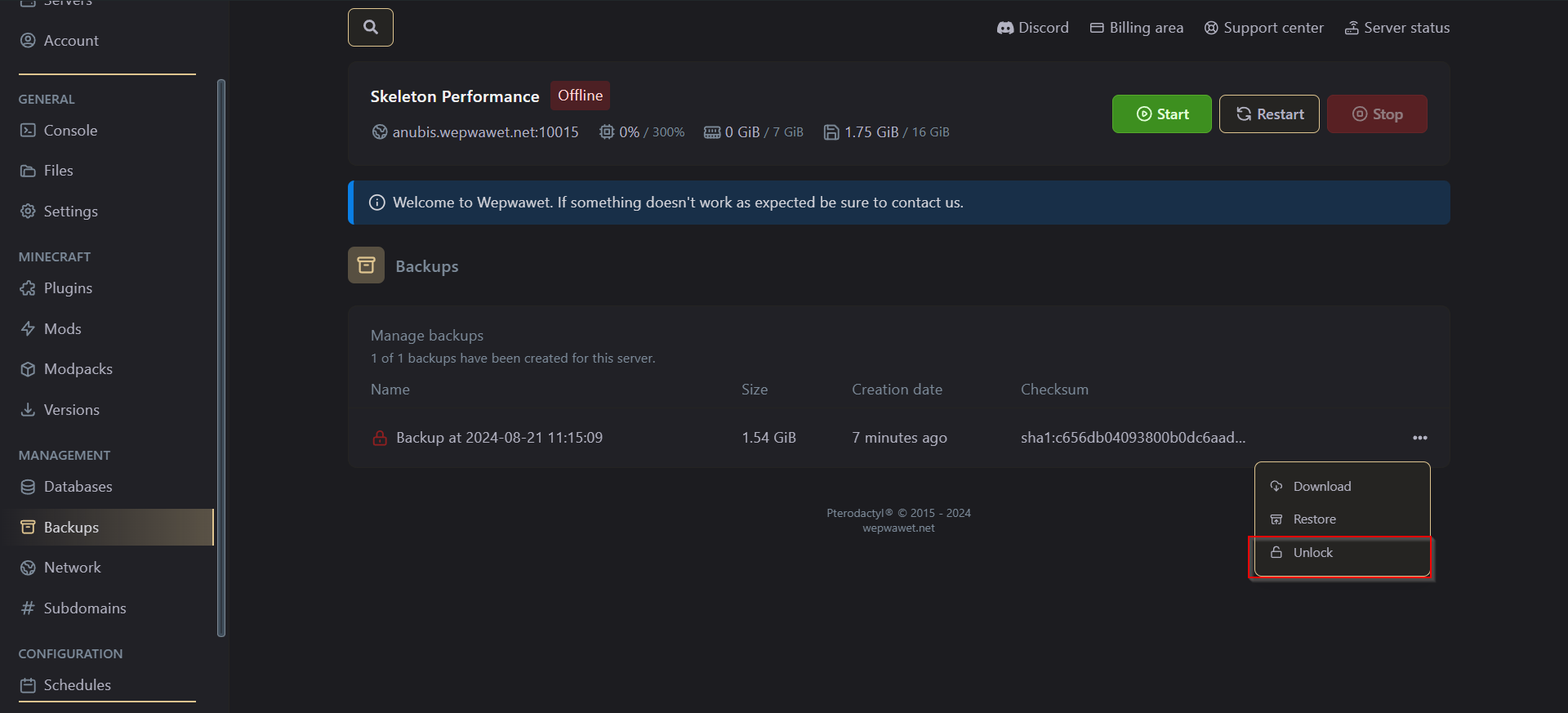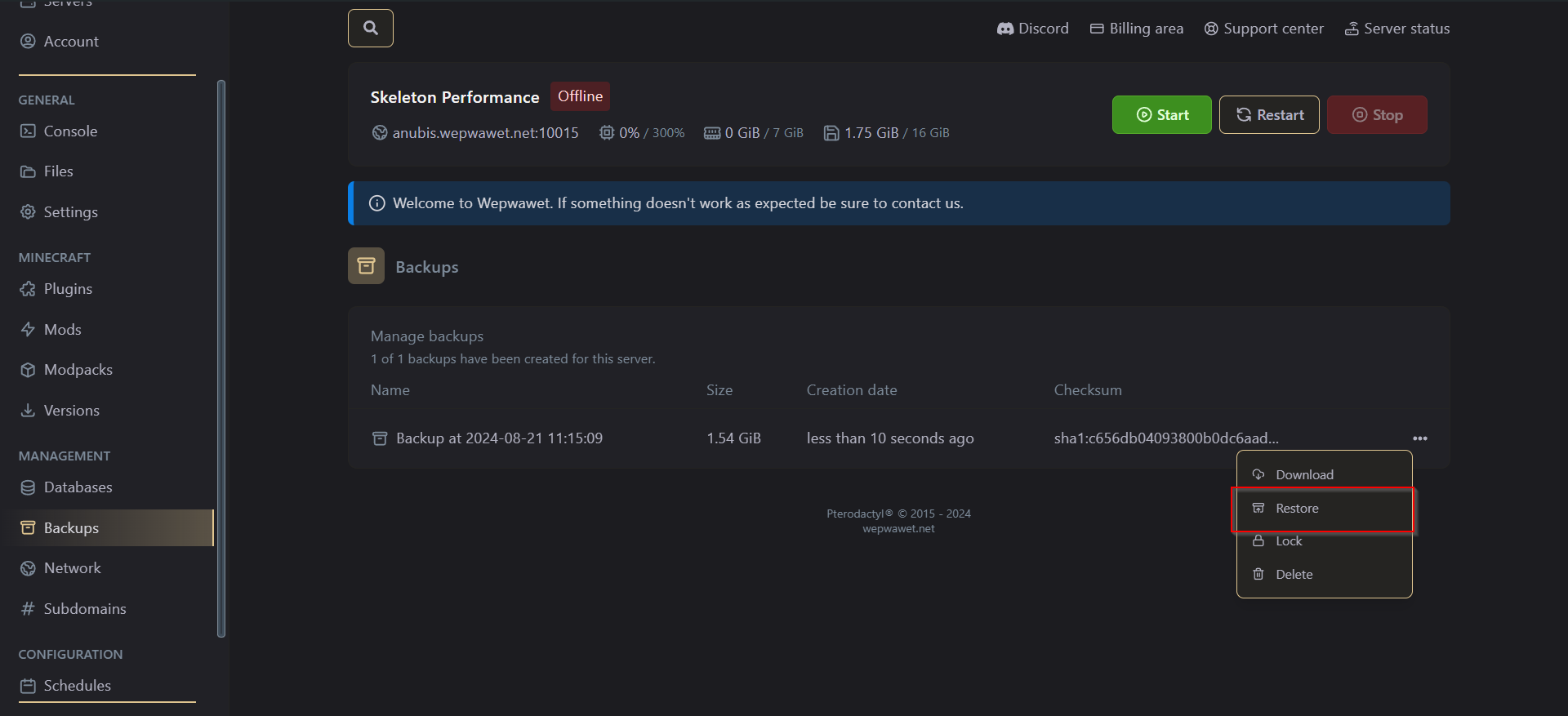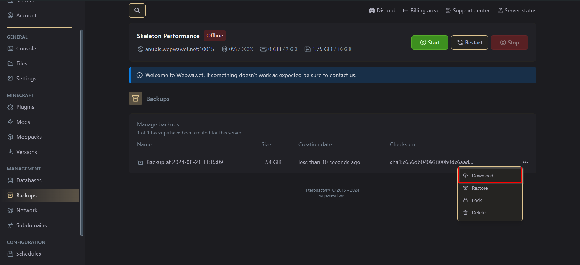You are able to see the current backup you have of the server.3. Download your backup.