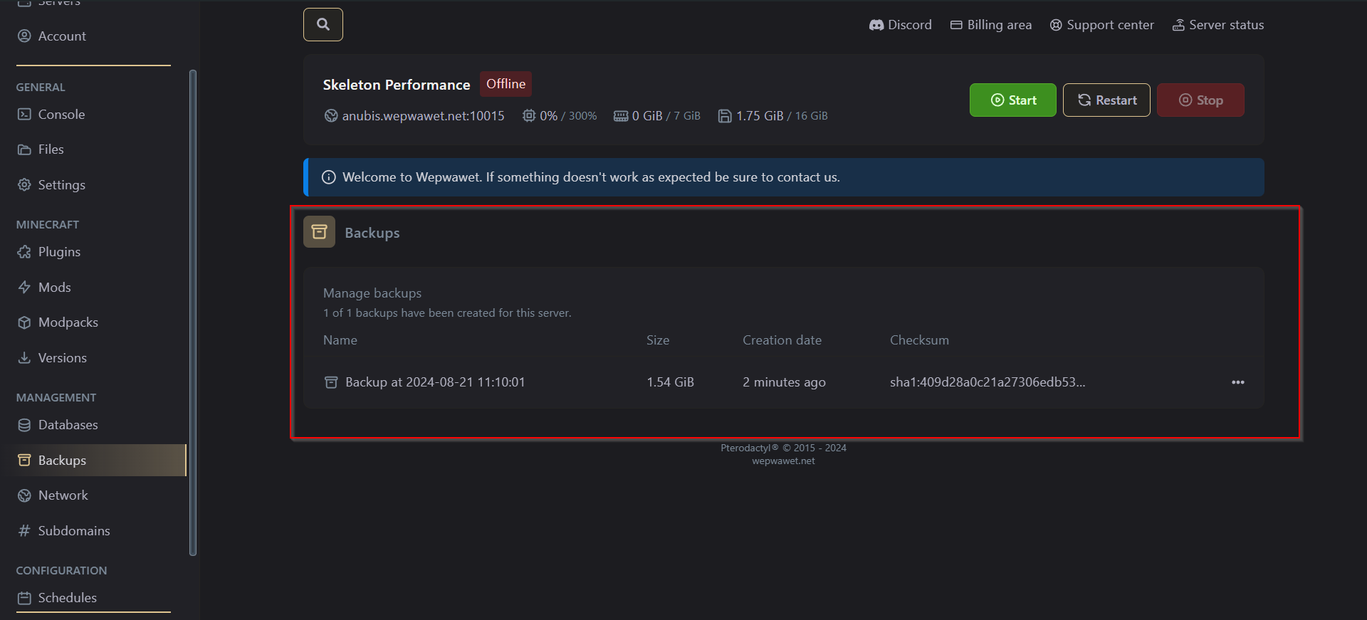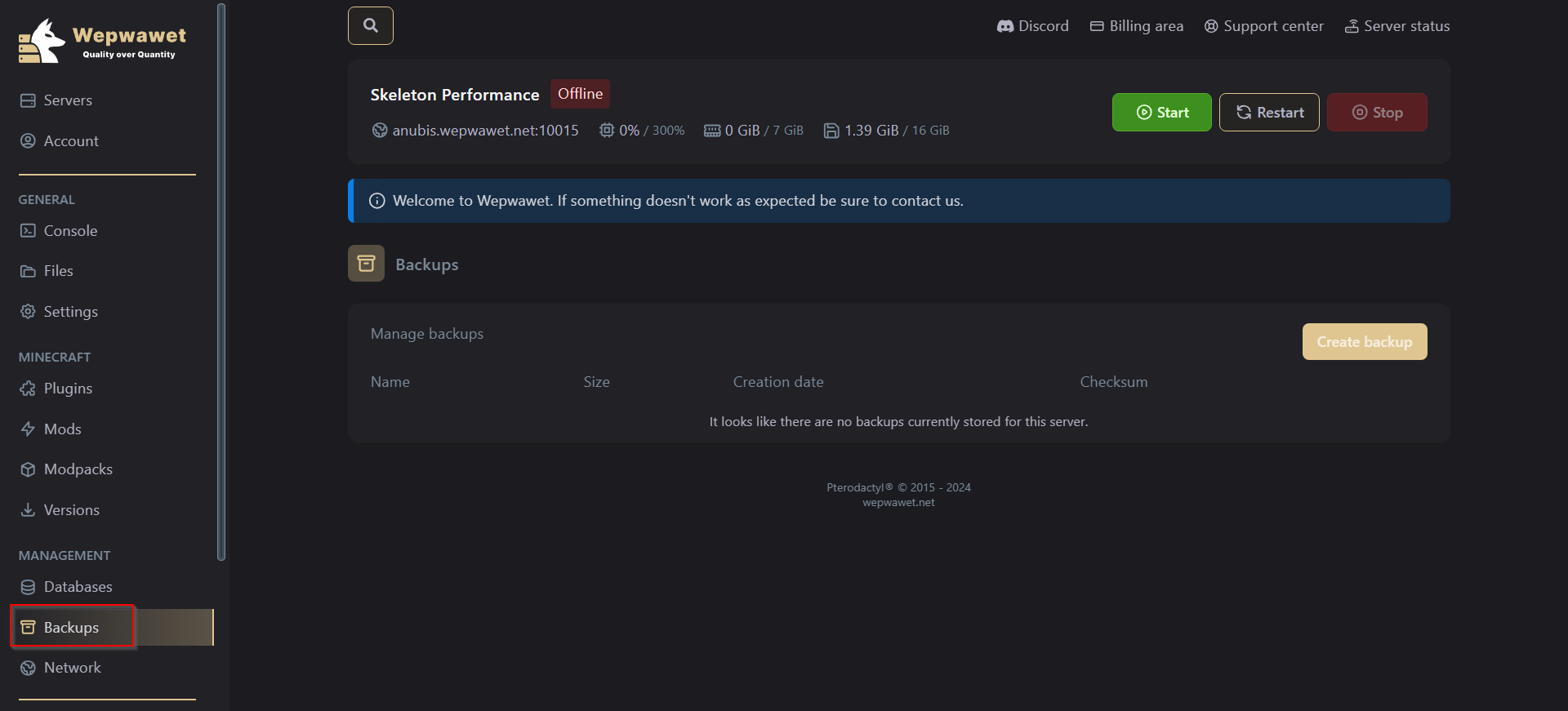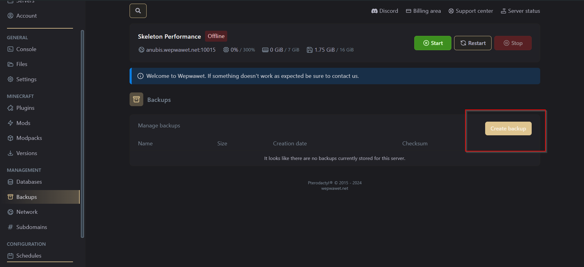 Clicking on the Create Backup creates a new backup of the server.2. View your current Backups.