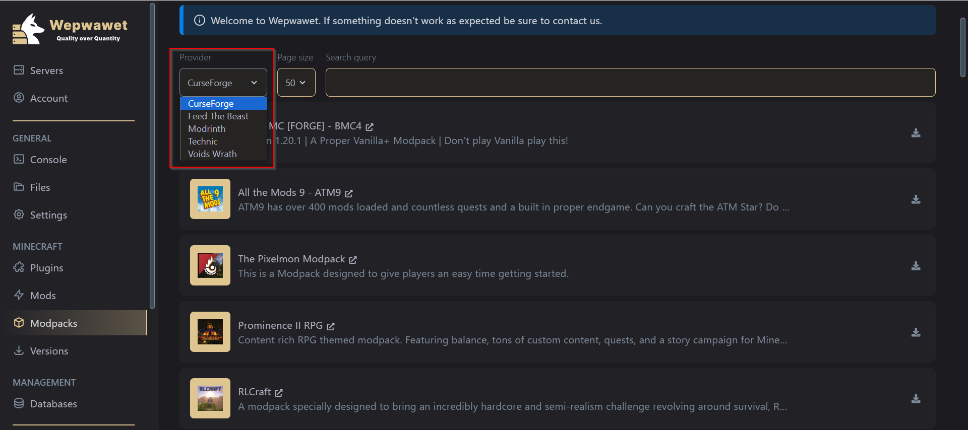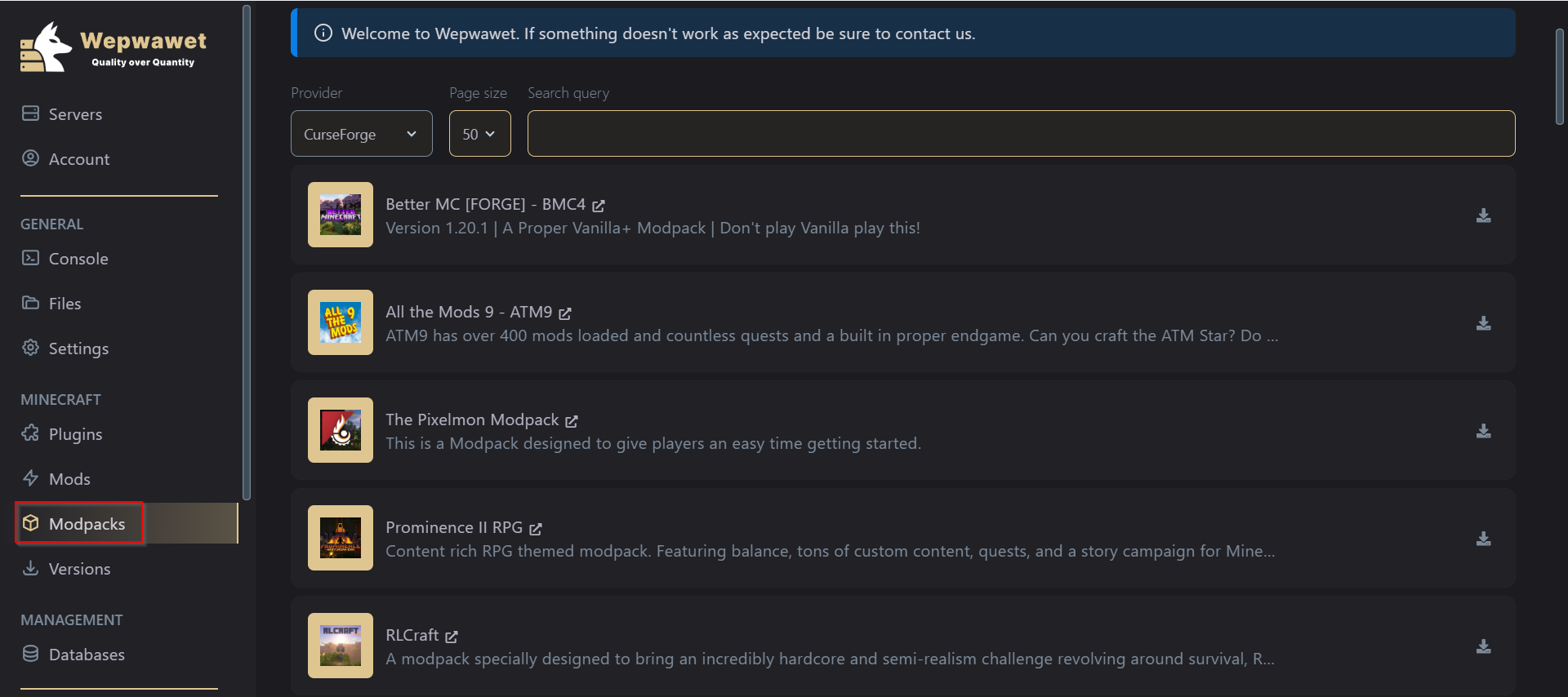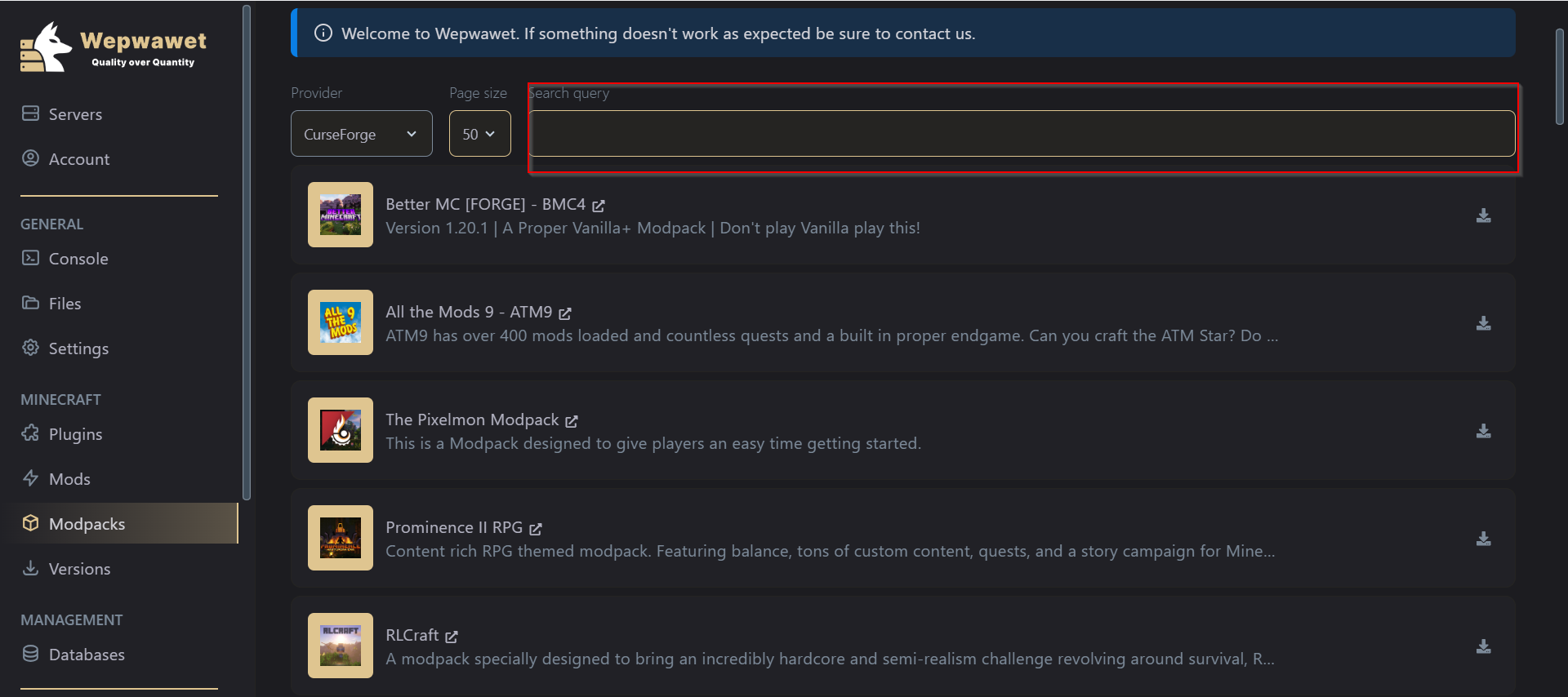 In this box, you can enter the name of the modpack you would like to install and click on Install button at the far right side for the preferred modpack.