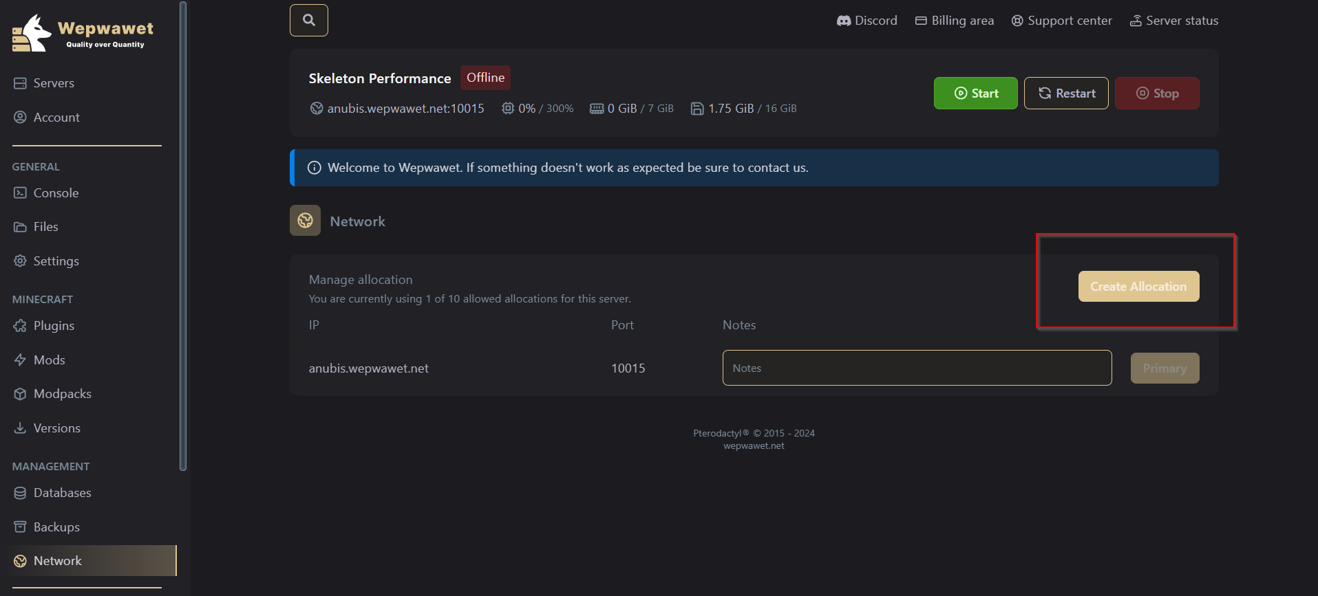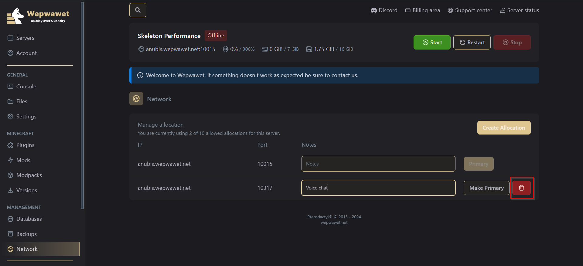 You can create a new port allocation for any other use other than primary minecraft server port.