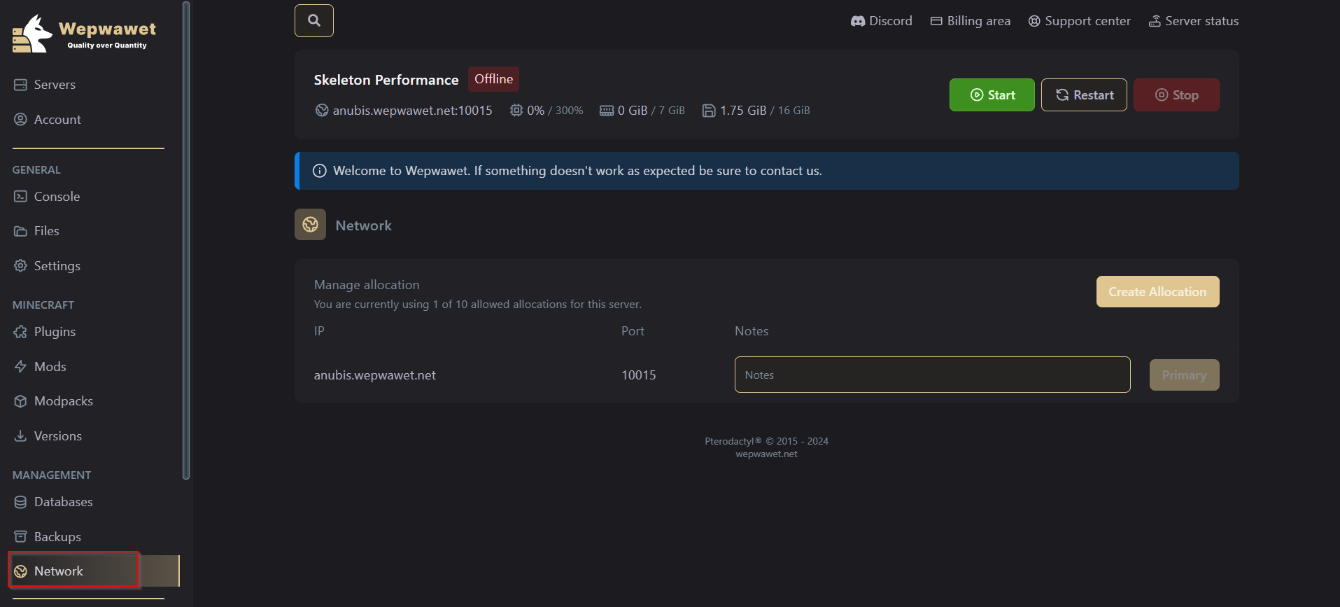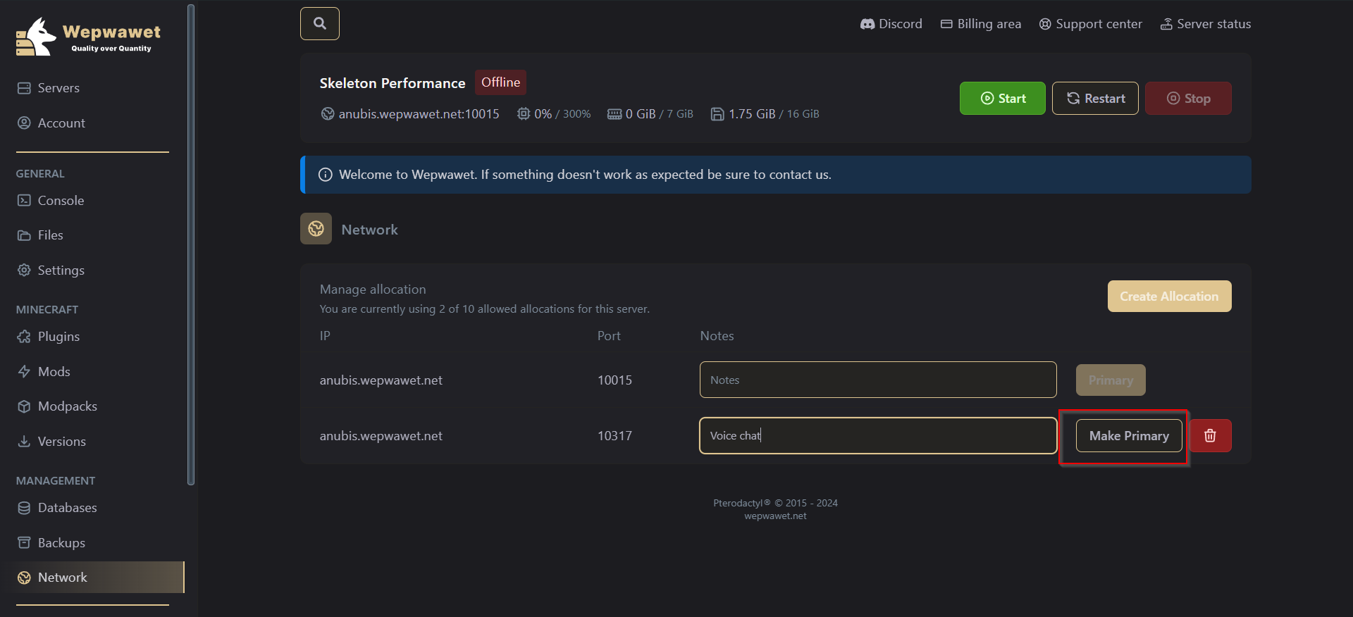 The server is hosted on a primary port (which is marked but the blacked out ‘Primary’ Button).