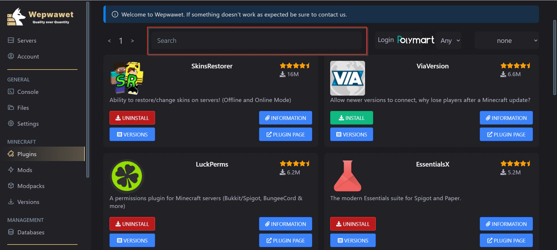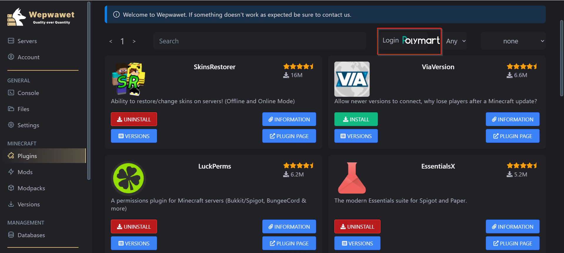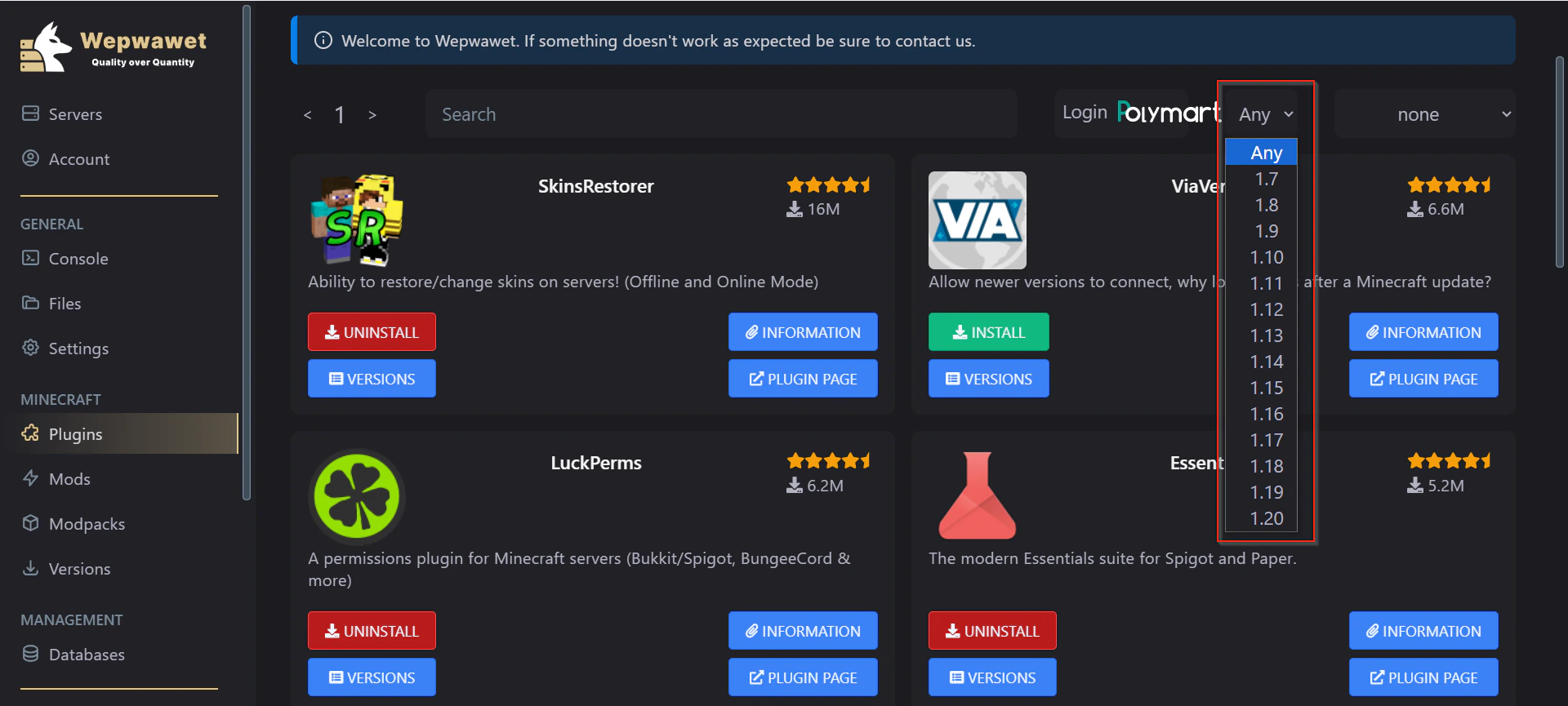 When logged in, You’ll be able to see the plugin that you’ve purchased from Polymart Note: After your sign in, confirm, and return to the panel, You will see a error. Do not worry, close the tab and return here where you will be signed into Polymart.3. Select your prefered minecraft version for the plugin