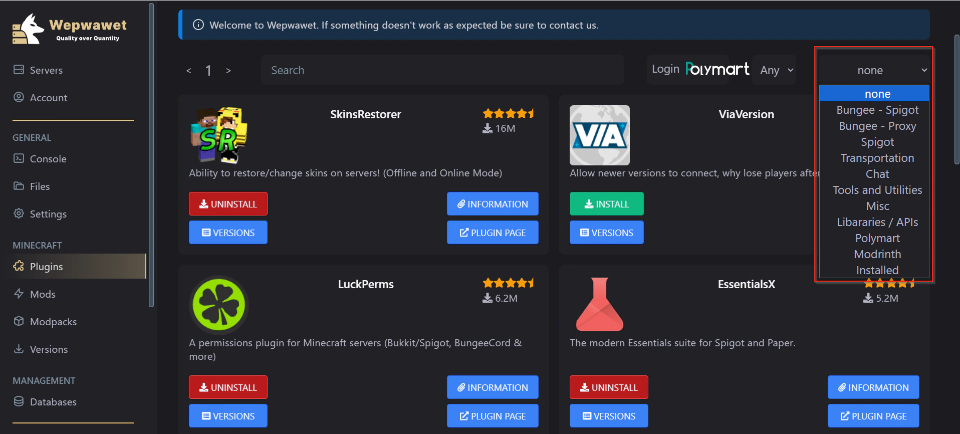 Using this option, You can narrow down your searches of the plugin you require to your prefered reason like Chat, Misc etcThere you go! You now know how to use the Plugins Tab! IF ANY ISSUES ARISE, MAKE SURE TO CONTACT US