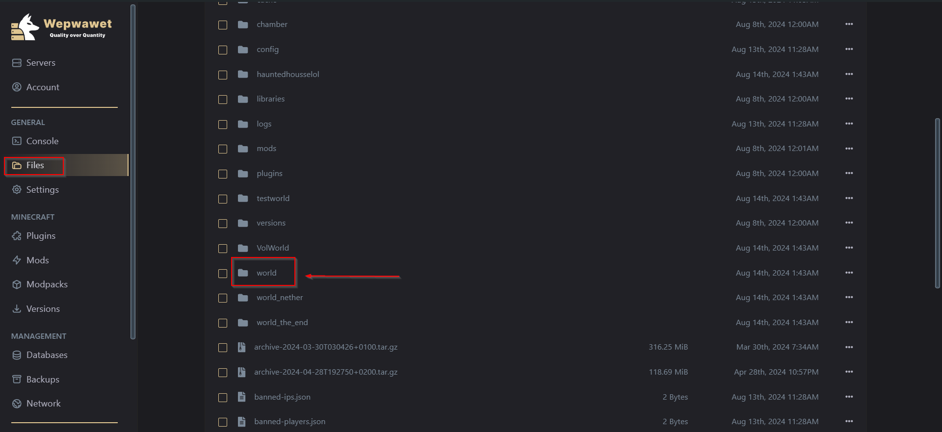 Under the General Section, Click the Files tab and select your current world folder.
