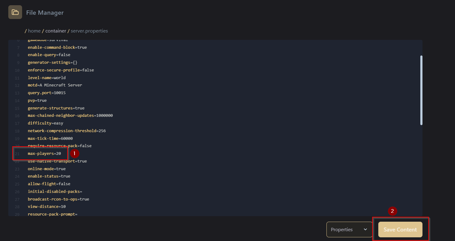 Scroll down to till you see max-players: [value] and edit the [value] to your prefered number and hit the Save Content button