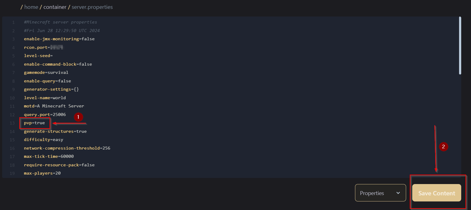 After that, Click on the server.properties file and go to the line pvp=[value]. If you’d like PvP to be enabled change [value] to true and if you’d like it to be disable change [value] to false and then click on the Save Content or CTRL+S