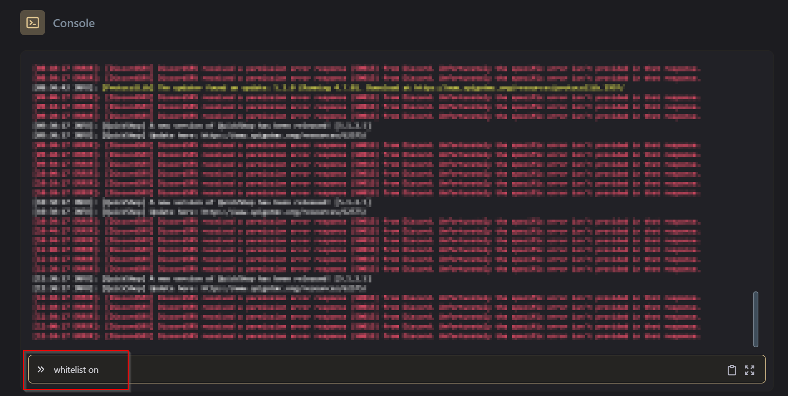 In the Console, Type whitelist [value]. If you’d like whitelist to be enabled, change [value] to on and if you’d like it disabled, change [value] to off.